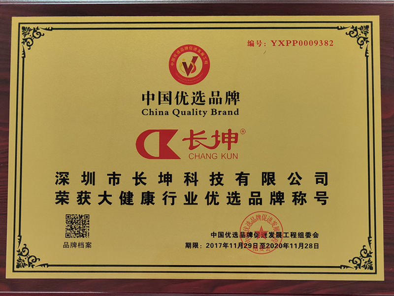 2017年12月,深圳市長坤科技有限公司成功被中國優(yōu)選品牌促進發(fā)展工程選中,評選為“中國優(yōu)選品牌”,并授予其“大健康”行業(yè)優(yōu)選品牌稱號,以茲鼓勵。
